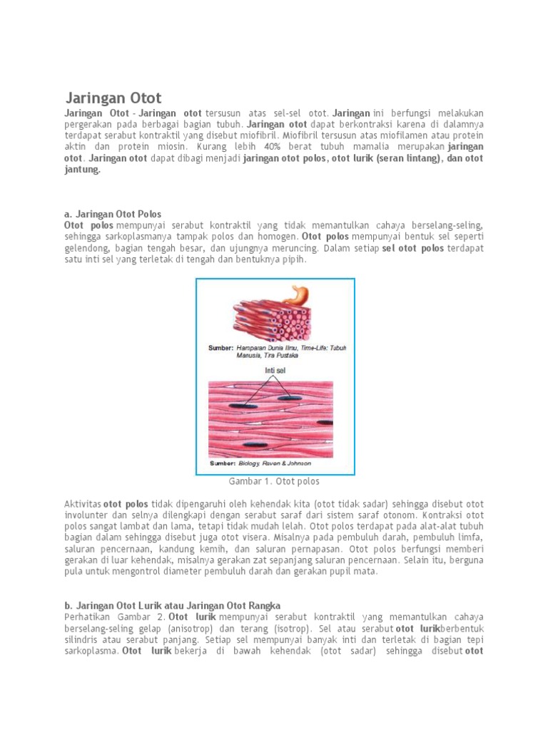 Otot diklasifikasikan menjadi tiga jenis yaitu otot lurik, otot polos dan otot jantung. Jaringan otot yaitu sekumpulan sel yang biiasa disebut dengan miofibril dan serat otot. Sistem skeleton dibagi menjadi 3 yaitu: Otot polos otot lurik otot jantung. Bentuknya gelondong kedua ujungnya lancip , inti selnya di tengah, contohnya terletak pada saluran pencernaan seperti lambung. Jaringan otot volunter ialah jaringan otot yang bekerja atau berkontraksi dibawah pengaruh kesadaran karena dilengkapi dengan jaringan syarf berdasarkan fungsi dan struktur penyusunnya, jaringan otot dapat dibedakan menjadi 3 yaitu: Fungsi jaringan otot manusia sangatlah penting untuk tubuh. Setiap jaringan otot disarafi oleh beberapa saraf motor. Skeleton aksial skeleton yang terletak di bahagian median badan. Berdasarkan ciri khasnya, jaringan otot dibagi menjadi tiga, yaitu Miogenesis adalah proses yang terjadi. Jaringan otot adalah jaringan lunak yang ditemukan di sebagian besar hewan termasuk manusia dan dapat mendukung otot untuk berkontraksi. Pada jaringan otot polos, serat ototnya berbentuk gelendong dengan kedua ujungnya.